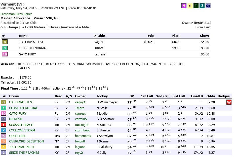 FIRST - VAGUY1 - 10 SECOND - 1MORE - 7 THIRD - CYPRESS - 5 FOURTH - VERTAIN5 - 3 FIFTH - TUESNIGHT - 1