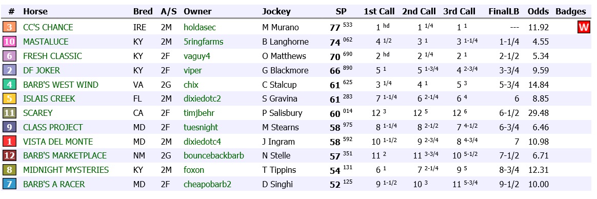 FIRST - HOLDASEC - 10 PLUS 100 CREDITS SECOND - 5RINGFARMS - 7 THIRD - VAGUY4 - 5 FOURTH - VIPER - 3 FIFTH - CHIX - 1 SIXTH - DIXIEDOTC2 - 50 CREDITS