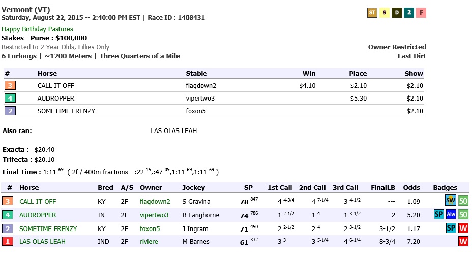 FIRST - FLAGDOWN2 - 10 PLUS 100 CREDITS SECOND - VIPERTWO3 - 7 THIRD - FOXON5 - 5 FOURTH - RIVIERE - 3 FIFTH - NO RUNNER - 1 SIXTH - NO RUNNER - 50 CREDITS